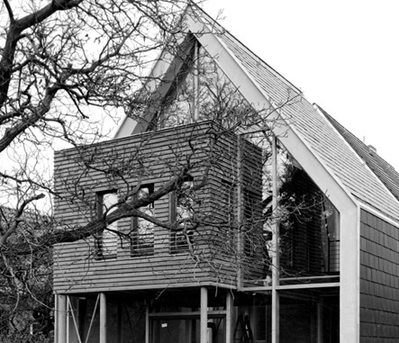 Sanierung und Erweiterung eines Einfamilienhauses um einen haushohen Wohnraum mit jeweils eingeschobener Schlaf- und Küchenbox in Holzständerbauweise in Zusammenarbeit mit Martin Krehl