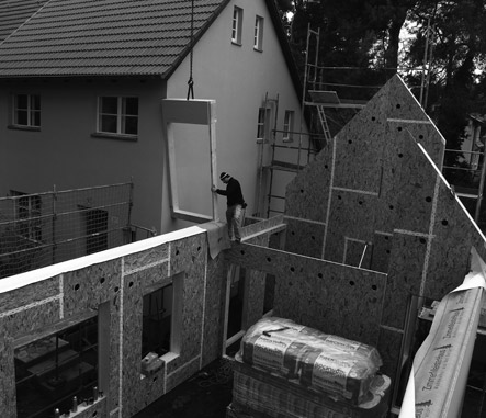 Ausbau und Vergrößerung eines Reihenendhauses, sowie Erweiterung um eine Gewerbenutzung in Holzständerbauweise.